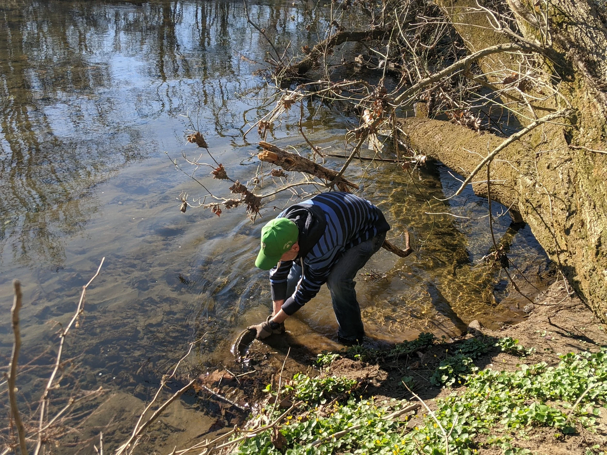Kevin pulling an old tire from the muddy bank